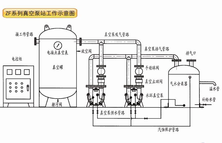 ZF系列真空負壓站(又名真空發(fā)生裝置、真空泵站等)是以一臺或二臺水環(huán)真空泵作為真空獲得設備,以真空罐作為真空存儲設備的成套系統(tǒng)。過于頻繁使用真空源所需抽氣量不太大的場合,該系統(tǒng)比直接使用真空泵大大節(jié)約了能源,并有效提高了真空泵的使用壽命。,該設備可以為國內(nèi)各類大中型醫(yī)院提供醫(yī)用氣體中心站的真空源,并廣泛應用于化工、醫(yī)藥行業(yè)的真空站,輕工業(yè)的灌裝系統(tǒng)、汽車行業(yè)橡膠工程零件的負壓成型,煤炭礦山用工作原理中阻燃輸送帶的浸漬和鑄造行業(yè)(V法、VRH、V-EPC)的真空源等。