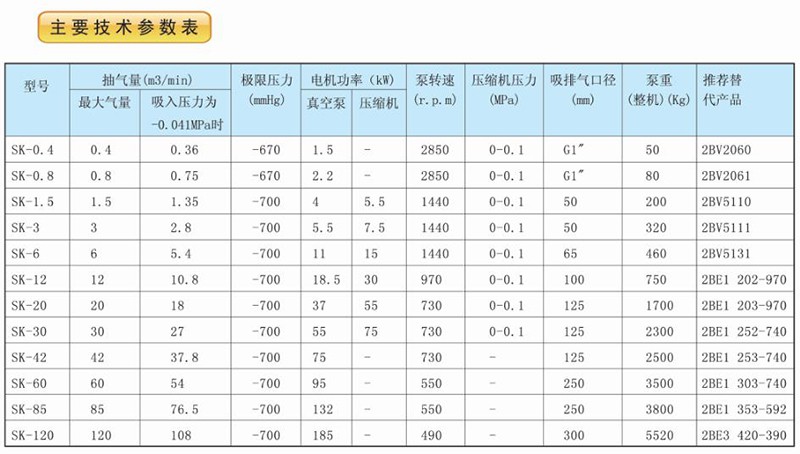 SK系列水環(huán)式真空泵及壓縮機(jī)被廣泛應(yīng)用于機(jī)械、石油化工、制藥、食品、制糖工業(yè)及電子領(lǐng)域。由于在工作過程中氣體的壓縮過程是等溫的,所以在壓縮和抽吸易爆炸氣體時,不易發(fā)生危險,所以其應(yīng)用更加廣泛。作為80年代的水環(huán)真空泵技術(shù),SK系列水環(huán)泵目前雖仍有用戶在使用,但因其效率低,性能差,將逐漸被2BV、2BE1 系列節(jié)能水環(huán)泵所取代。
